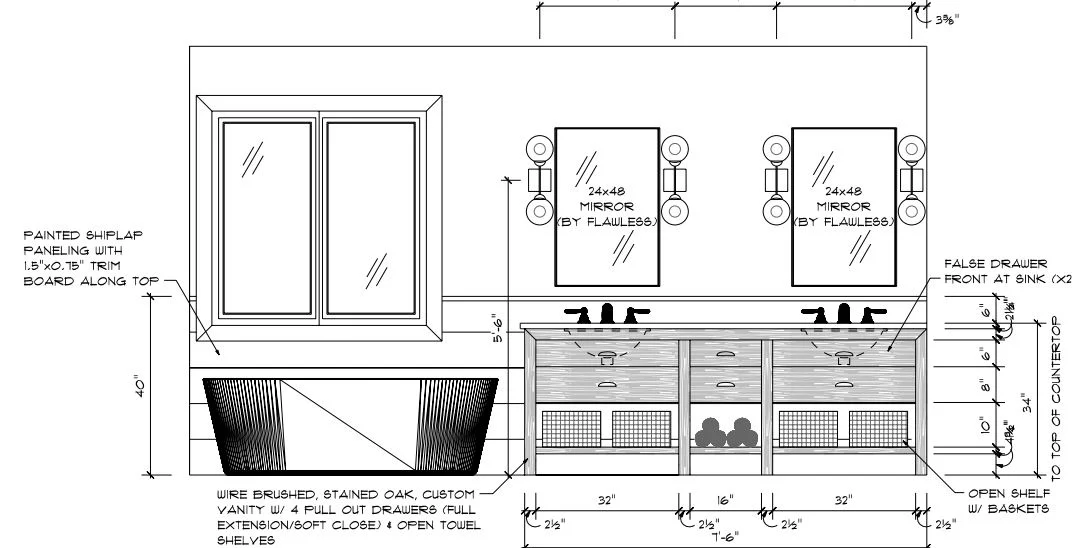 Well here it is…Custom craftsman-made vanity, custom tiled shower complete with leg-shaving foot niche, and soaker tub to drift away in. Oh, did I mention the shiplap wood paneling that made this bathroom sing! (thanks Fixer Upper).